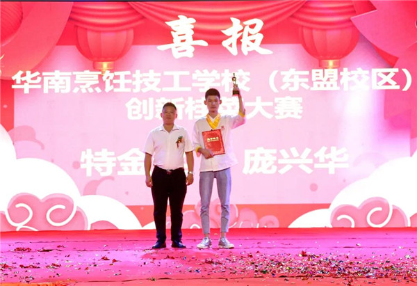 是不是很多同学还沉浸在国庆假期的欢乐情绪当中?就在上个月底学校举办的国庆迎新晚会上,除了欢歌笑语的表演外,还进行了2021年创新桂菜校园烹饪大赛的颁奖仪式,而今天话题的主角,就是大赛特金奖的获得者,是今年17岁的庞兴华。