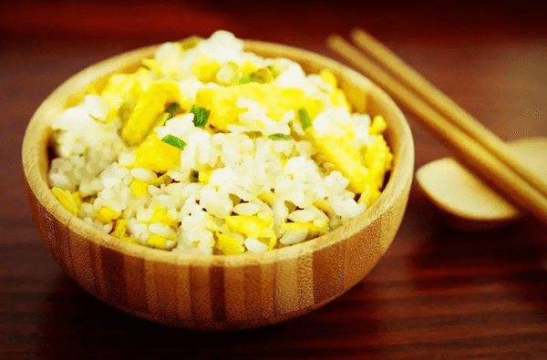 2、把米饭放入锅内翻炒,把鸡蛋液倒入饭中,继续翻炒。