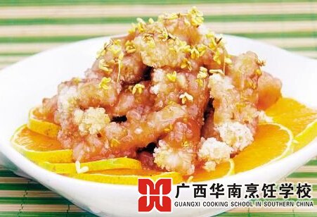 桂花又名木犀,含多种香料物质,可用于食用或提取香料。鸡胸肉肉质细嫩,滋味鲜美,营养丰富,能滋补养身。桂花鸡柳成菜后,鸡柳脆嫩,桂香浓郁,色泽美观,让人胃口大开。