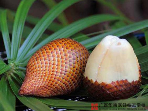 蛇皮果产于印尼等热带地区,棕褐色的外皮上覆盖一层密密麻麻的鳞片,像是蛇皮,因此形象地称为"蛇皮果"。蛇皮果的果胶和钾含量居水果之首,对身体十分有益。