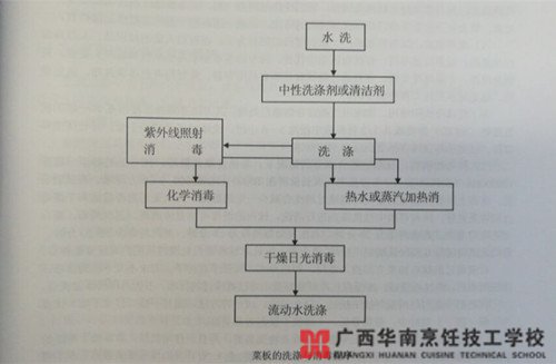 菜板的清洗和消毒有多种方法。如使用中性洗涤剂、用热水及炊帚刷仔细擦洗后进行水洗的方法;用去污粉代替中性洗涤剂的方法;或者在加热水洗涤后,在200毫克/千克浓度的次氯酸钠(NaCL0)溶液中浸泡5分钟的方法等等。其中杀菌效果最为有效的方法是清洗后煮沸法和蒸汽消毒法(5分钟以上)。此外,还有人建议经清洗及上述方法消毒后,在使用前应再用同样的方法重复消毒一遍,以确保使用前菜板卫生。菜板的洗涤与消毒程序,如下图所示。