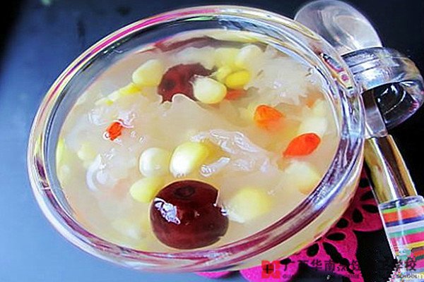 2、煮沸清水,先放雪耳红枣和枸杞煮40分钟,雪耳软烂后放玉米和冰糖再煮20分钟即可。