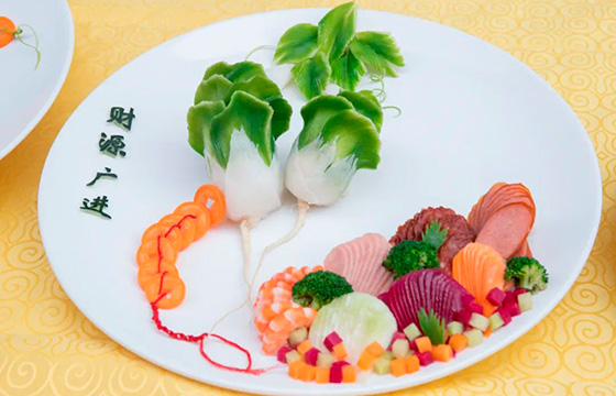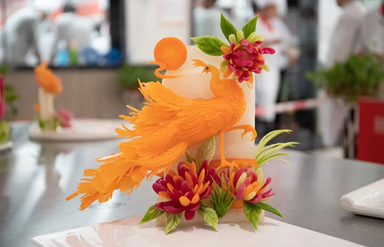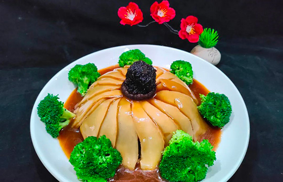 银牙鸡丝、菊花鱼、香菇蒸滑鸡、碧绿炒鲜鱿,花开富贵雕刻