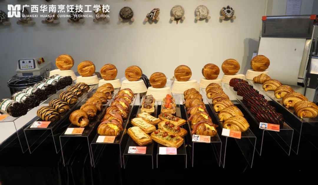 1、面粉识别及面包基本功手法练习和面、揉面、醒面、搓条、下剂、搓圆、橄榄包、卷长条、八字包、辫子包、三角包、风车包、梅花包、菠萝面包包面手法、牛角包、捏蛋挞皮、麦穗形等)